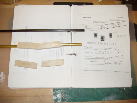 To begin this saga a brief description of the wing is required. It consists of three panels, two outers, which include permanently attached tips & a centre panel to which the outers are joined using brass tubes in joiner boxes & 10mm carbon location bars. The wings are of conventional layout except for the spar construction which consists of tapering carbon top & bottom caps, epoxy bonded to a vertical grain balsa core, the whole thing being wound with Kevlar thread under considerable tension & finally coated in epoxy. The sequence of build has to be tip panels first, then outers & finally the inner panel. This is so that any adjustment to the dihedral is undertaken in the next larger panel. The span is 3.25 Metres and the sections change from AG35 in the centre through AG36 to AG37 at the tip.