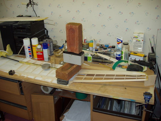 The wing tips are added & the Kevlar binding completed. Note the amount of weight used here whilst the epoxy sets. This is the same for all the vertical spar webs, which are added one at a time and allowed to set.