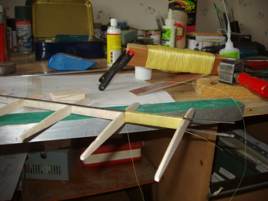 The ribs are cut from 1/8” medium balsa & the spar web from ¼” hard end grain balsa. I progressively assembled these onto the bottom carbon spar with epoxy and weighed it down with a couple of house bricks. The bottom spar has to be handled with care, as it is only .007” thick. This is not a printing error; it actually is .007” thick. The top spar is .014”; this is because carbon is much better in tension than compression. Having now got the skeleton of the panel together, before we can proceed we now have to bind the spar assembly with Kevlar thread. This is a mind-blowing job, which took a couple of hours and made my arms ache, as the thread has to be under tension whilst being applied. The whole thing is then wetted out with thinned epoxy and allowed to cure. Note the spar carry -throughs for joining to the mid panel & the five Deg set of the end rib, half the dihedral angle.