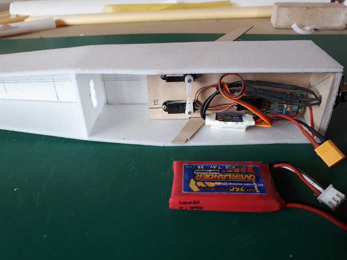4. You can see that my hardware is grossly large for the model, but the connector is an ST20, so scale effect applies. I used CF rod and paperclips from servos to tail surfaces.