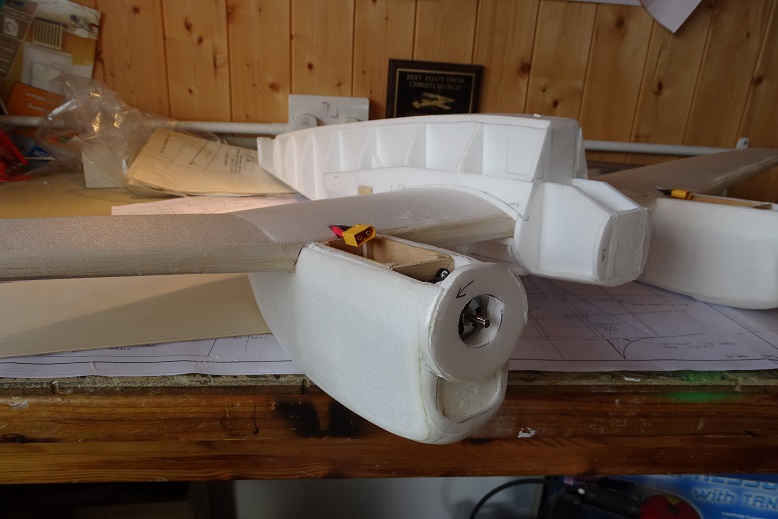 The nose cone, cockpit and observer’s dome are all pink foam, HWC, carved and sanded to shape. The dome needed an aperture to be HWC from the fuselage - all that careful work and then you cut a great hole in it! You can see that there is an additional layer of 6mm along the fuz top to bring it to scale size and shape. This was always the plan, but it very nearly got forgotten in the rush to finish off. Almost the whole model was covered in tissue from a stash of Esaki (Mike Woodhouse free flight supplies), with a coat of DeLuxe Models Eze Kote *rolls eyes* all over, followed by a light sanding, then the tissue applied damp, with more Eze Kote. I somehow forgot to cover the top of the tailplane and the fin and rudder, and as a results they look and feel rough as a badger compared with the wing, nacelles and fuselage. Hiding the tissue join and edge lines is possible, but tricky. I do strongly recommend covering these models with tissue: it adds a bit of strength and ding resistance and gives a decent smooth surface for painting.
